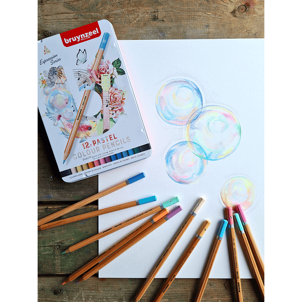 Los lápices Expression de BRUYNZEEL, poseen una mina resistente y pigmentos de gran calidad para un excelente desprendimiento del color. Esta caja contiene 12 lápices de colores pastel.